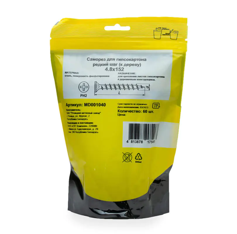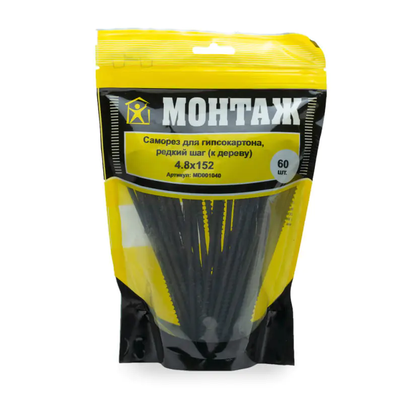 Саморез 4,2х152 мм предназначен для надежного крепления гипсокартона к деревянной подконструкции. Изготовлен из стали, поверхность фосфатирована или оксидирована, что придает ему дополнительную прочность и защиту от коррозии. Наконечник острый, головка потайная с крестообразным шлицем РН2.