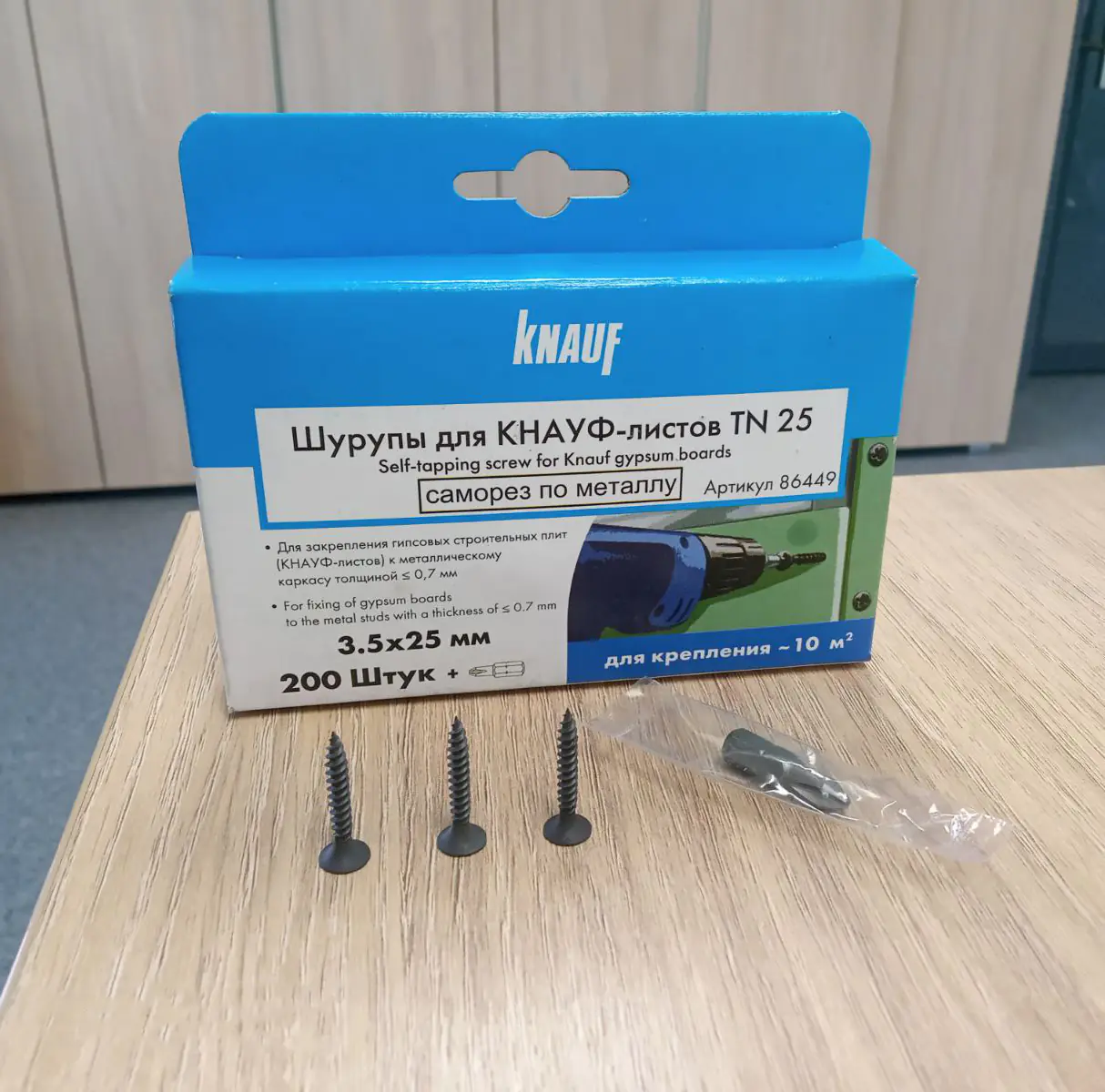 Высококачественные Knauf-саморезы для крепления гипсокартонных плит к металлическому профилю толщиной до 0,7 мм. Для применения в сухих, нормальных и влажных помещениях. Обладает повышенной коррозионной стойкостью. В пачке 200 штук. Комплектуется битой Ph2. Цена за пачку.