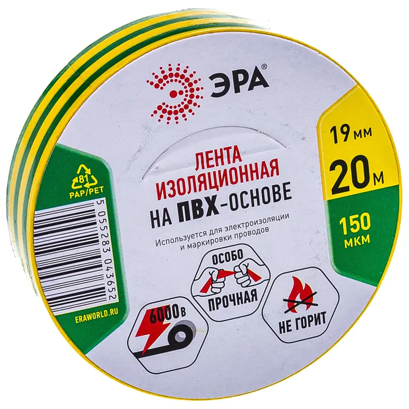 ПВХ-изолента 19мм х 20м желто-зеленая cлужит для электроизоляции кабелей или проводов. Изделие представляет собой резиновую основу с ПВХ-пленкой, которая обладает клеевым слоем.