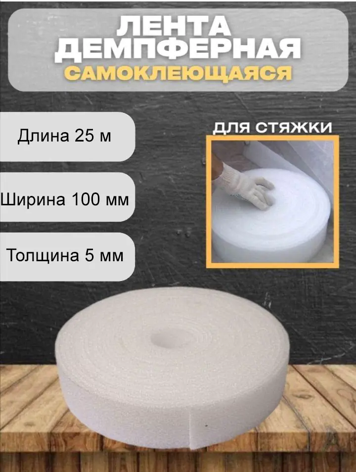 Демпферная лента с клеевым слоем для устройства стяжки пола изготовлена из вспененного полиэтилена (материал который не подвержен гниению, практически не впитывает влагу). Она крепится по периметру помещения при подготовке к заливке цементной стяжки и остается там на весь срок службы пола. Высота ленты 100 мм. Толщина 5 мм. В рулоне 25 м.п.