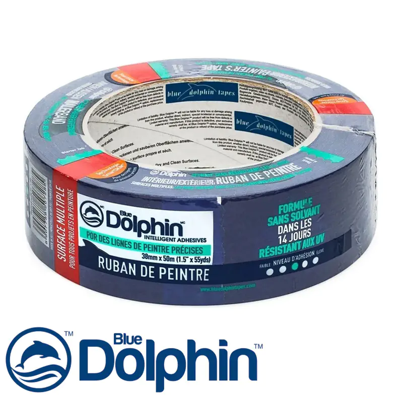 Профессиональная малярная лента синего цвета Blue Dolphin. Длина 50 м. Ширина 38 мм. Не содержит растворителей, не оставляет следов клея, УФ устойчивая. Обладает средней клеющей способностью. Чаще всего используется на свежеокрашенных, деликатных поверхностях. Подходит для внутренних и наружных работ. Время использования 14 дней. Цвет синий.