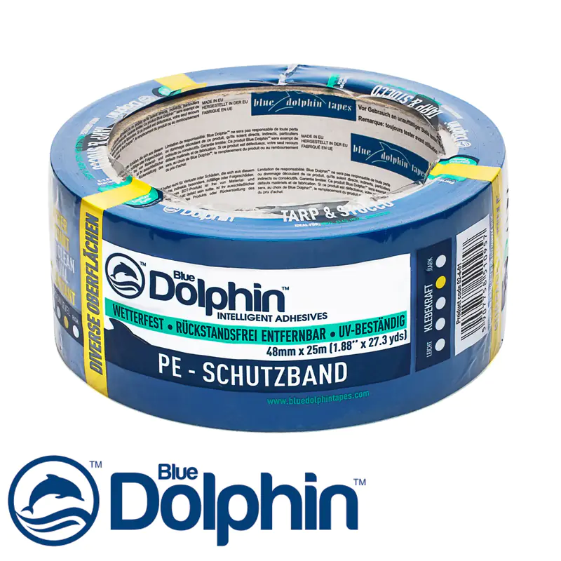 Лента малярная ПВХ голубого цвета Blue Dolphin. Длина 25 м. Профессиональная, УФ-стойкая. Отличается от обычной малярной ленты тем, что не размокает от влаги. Чаще всего используется для оклейки окон и отбивания ровной линии при покраске. Также практически не оставляет клейких следов после снятия и не снимает краску после отклеивания. Время использования 30 дней.