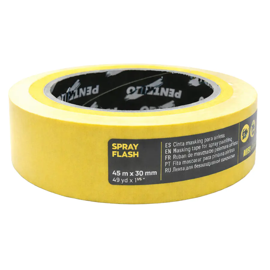 Малярная лента Pentrilo Spray Flash шириной 30 мм. Полукрепированная лента с каучуковым клеем на основе растворителя с высокой адгезией. Используется для механизированной покраски, для авторемонта и декоративных отделочных работ. Время работы в интерьере не более 10 дней, на фасаде — не более 3-х дней.