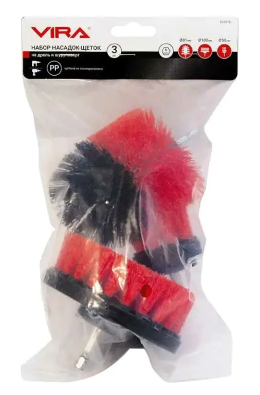 Насадки-щетки выполнены из абразивного нейлона, используются для чистки ванны, раковины, плинтусов, сантехники, плитки и плиточных швов, а также многого другого. В наборе насодок-щеток на дрель VIRA 3 щетки разного диаметра. Хвостовик - 6.35 мм.