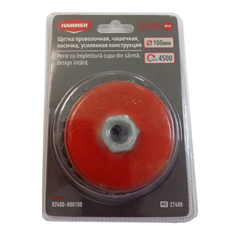 Щетка-крацовка чашечная проволочная косичка 100 мм HAMMER 02400-800100 применяется для щадящей очистки поверхностей от ржавчины, грязи, удаления лакокрасочных покрытий, получения заданной шероховатости. Размер резьбы М14.