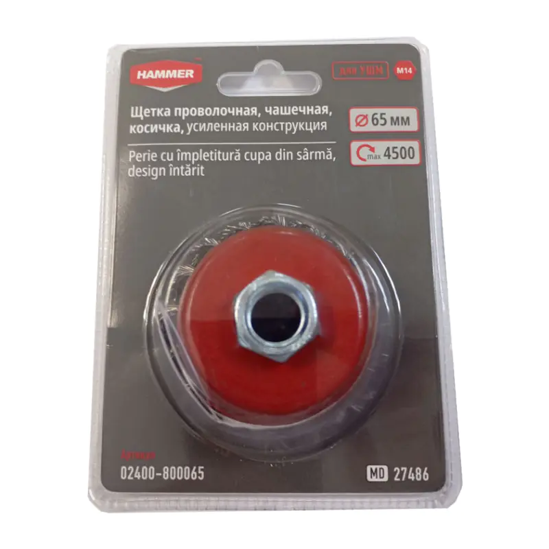 Щетка-крацовка чашечная проволочная косичка 65 мм HAMMER 02400-800065 применяется для щадящей очистки поверхностей от ржавчины, грязи, удаления лакокрасочных покрытий, получения заданной шероховатости. Размер резьбы М14.