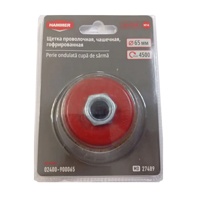 Щетка-крацовка чашечная проволочная гофрированная 65 мм HAMMER 02400-900065 применяется для щадящей очистки поверхностей от ржавчины, грязи, удаления лакокрасочных покрытий, получения заданной шероховатости. Размер резьбы М14.