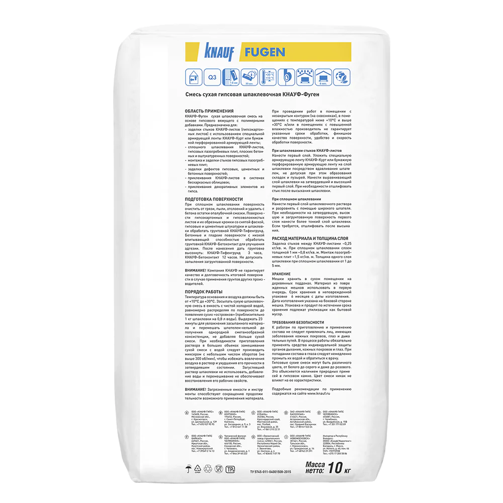 Шпатлёвка "Fugen" производства Knauf незаменима при реставрации повреждений гипсокартонных листов, заделке стыков с использованием ленты-серпянки, выравнивании бетонных поверхностей внутри помещений. Удобна для шпатлевания головок саморезов и швов между пазогребневыми плитами.