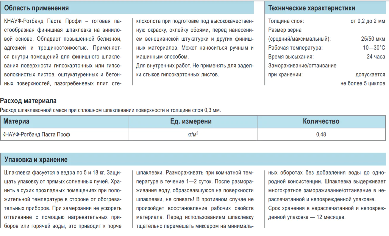 Финишная шпатлёвка "Ротбанд-Паста PROFI" фирмы КНАУФ применяется при подготовке поверхностей внутри помещений к покраске или оклейке обоями. Наносится на бетонные, кирпичные, гипсокартонные, гипсовые материалы.