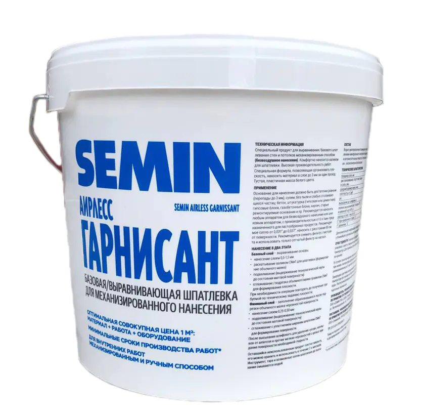 Выравнивающая шпатлёвка SEMIN AIRLESS GARNISSANT 20 кг. Готовая к применению, для высокопроизводительного машинного безвоздушного нанесения. Используется для внутренних работ в сухих помещениях. Наносить по ровным и неровным поверхностям с перепадом до 3 мм. Поверхность легко сглаживается широким шпателем, шлифуется.