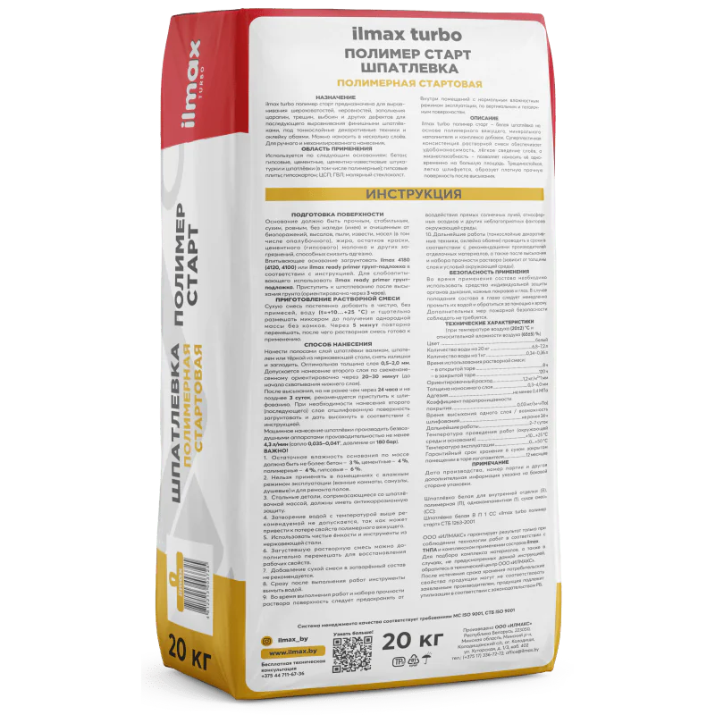 Основание должно быть сухим, прочным и стабильным, очищенным от пыли, извести, масел, жира, остатков старой краски и других загрязнений, способных снизить адгезию к основанию. При необходимости для первоначального выравнивания поверхностей стен и потолков может использоваться выравнивающая штукатурка. Поверхность перед нанесением ilmax turbo полимер финиш рекомендуется обработать грунтом ilmax 4180 (4120, 4100). При выполнении работ по ГКЛ грунтование не требуется. Шпатлёвочные работы проводить не ранее чем через 3 часа и не позднее чем через 3 суток после грунтования.