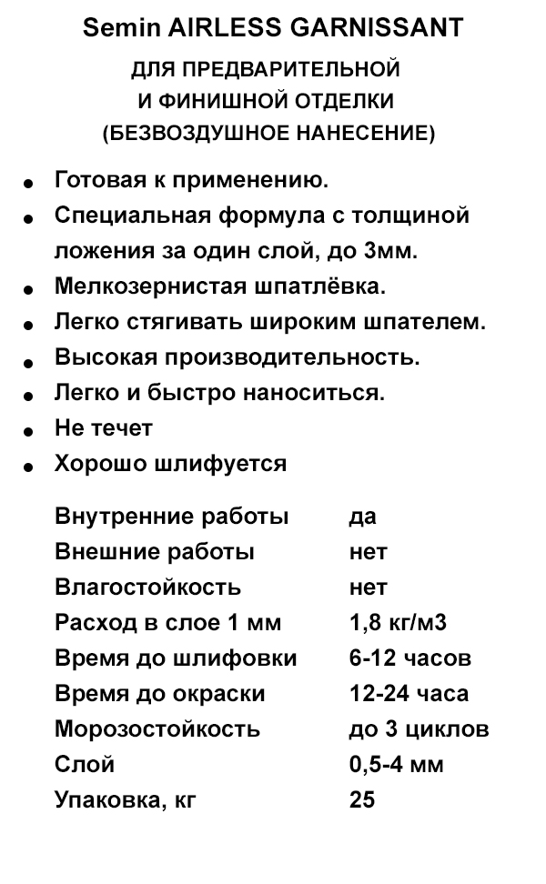 Выравнивающая шпатлёвка SEMIN AIRLESS GARNISSANT (синяя крышка). Готовая к применению, для высокопроизводительного машинного безвоздушного нанесения. Используется для внутренних работ в сухих помещениях. Наносить по ровным и неровным поверхностям с перепадом до 4 мм. Поверхность легко сглаживается широким шпателем, шлифуется.