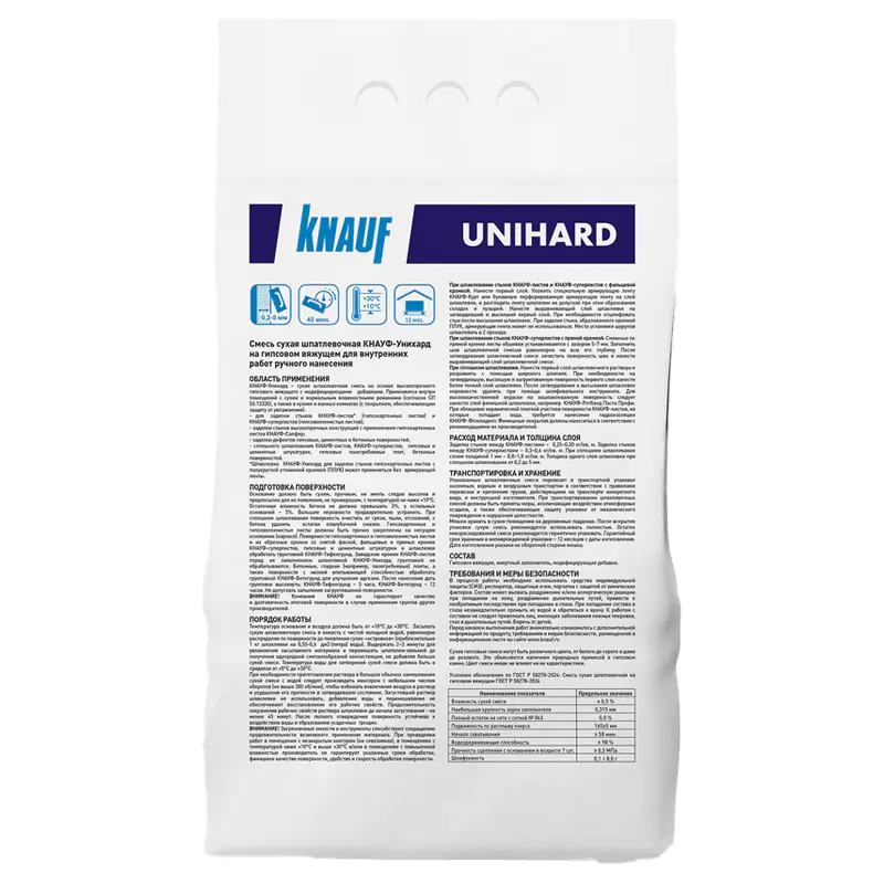 КНАУФ-Унихард – cухая шпаклевочная высокопрочная смесь для заделки стыков гипсокартонных и гипсоволокнистых листов и сплошного шпаклевания поверхности. Фасовка 5 кг.
