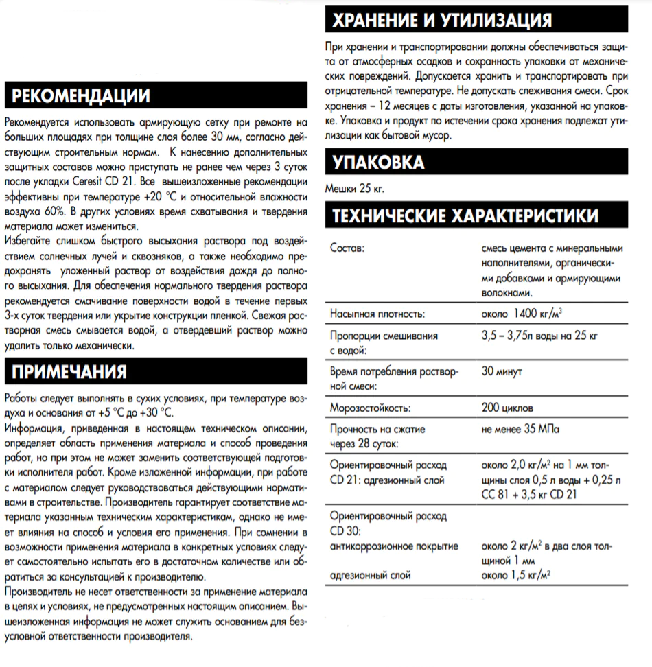 Рекомендуется использовать армирующую сетку при ремонте на больших площадях при толщине слоя более 30 мм, согласно действующим строительным нормам. К нанесению дополнительных защитных составов можно приступать не ранее чем через 3 суток после укладки Ceresit CD 21. Все вышеизложенные рекомендации эффективны при температуре +20 °С и относительной влажности воздуха 60%. В других условиях время схватывания и твердения материала может измениться.