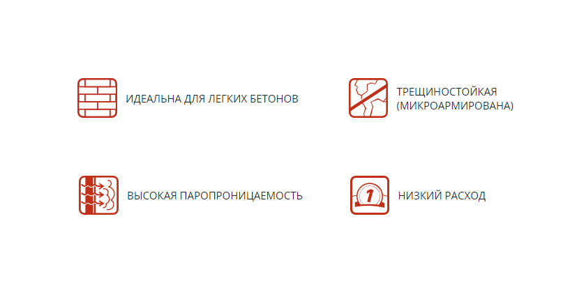 Содержит микроволокна для повышения стойкости к образованию трещин при влажностной усадке и деформациях.