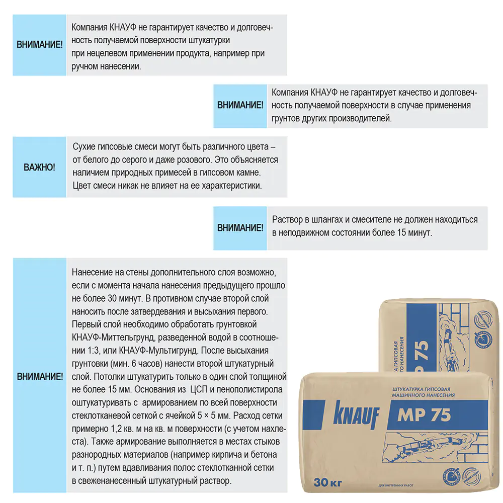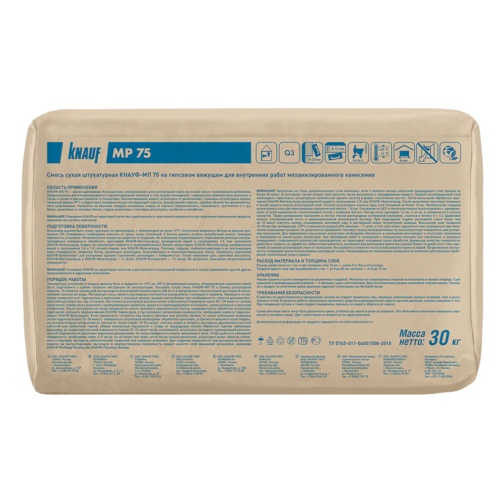 KNAUF MP 75 - универсальная сухая штукатурная смесь на основе гипса с полимерными добавками. Смесь КНАУФ-МП 75 предназначена для высококачественного оштукатуривания стен и потолков внутри помещений машинным способом. Штукатурку КНАУФ-МП 75 можно использовать для отделки помещений с нормальной влажностью, а также в кухнях и ванных комнатах с покрытием, обеспечивающим защиту от увлажнения.