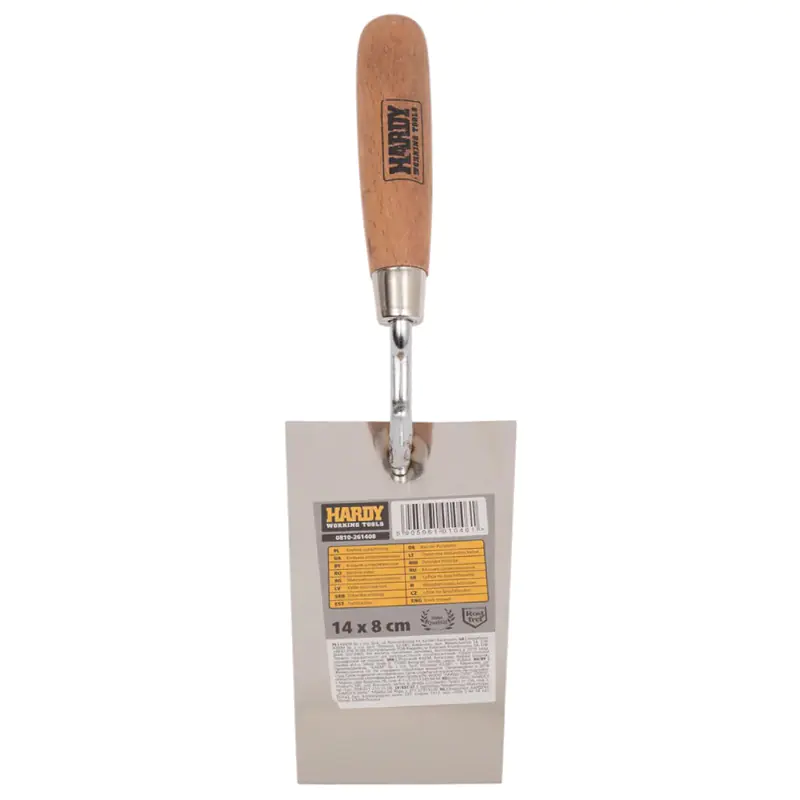 Кельма шпатлевочная четырехугольная HARDY используется для нанесения различных типов отделочных покрытий и клеевых растворов. Рабочая поверхность выполнена из высококачественной эластичной нержавеющей стали. Деревянная рукоятка хорошо ложится в ладонь, что повышает комфорт работы.