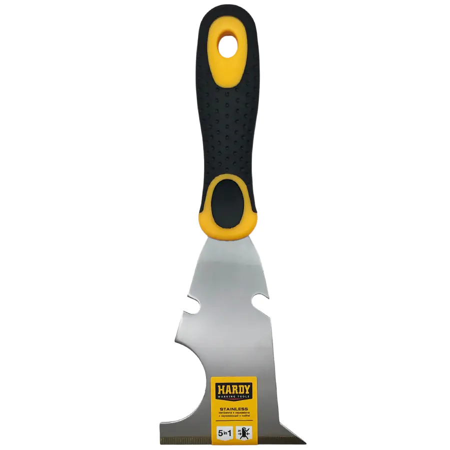 Мультишпатель Hardy широко используется в ремонтных и строительных работах, как для нанесения различных материалов на поверхности, так и для смешивания различных составов. Шпатель из нержавеющей и лакированной стали, усиленный. Рукоятка изготовлена из двухкомпонентного материала. Имеет разной формы края, что позволяет быстро и качественно удалить дефекты при работе.