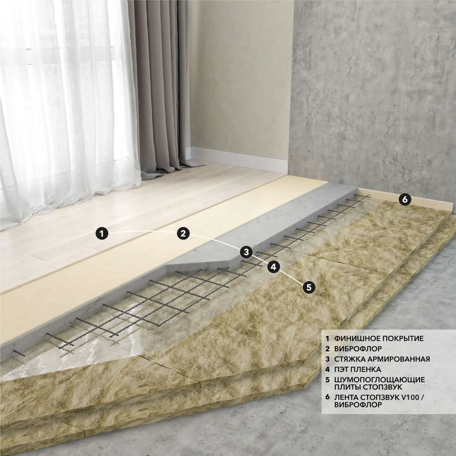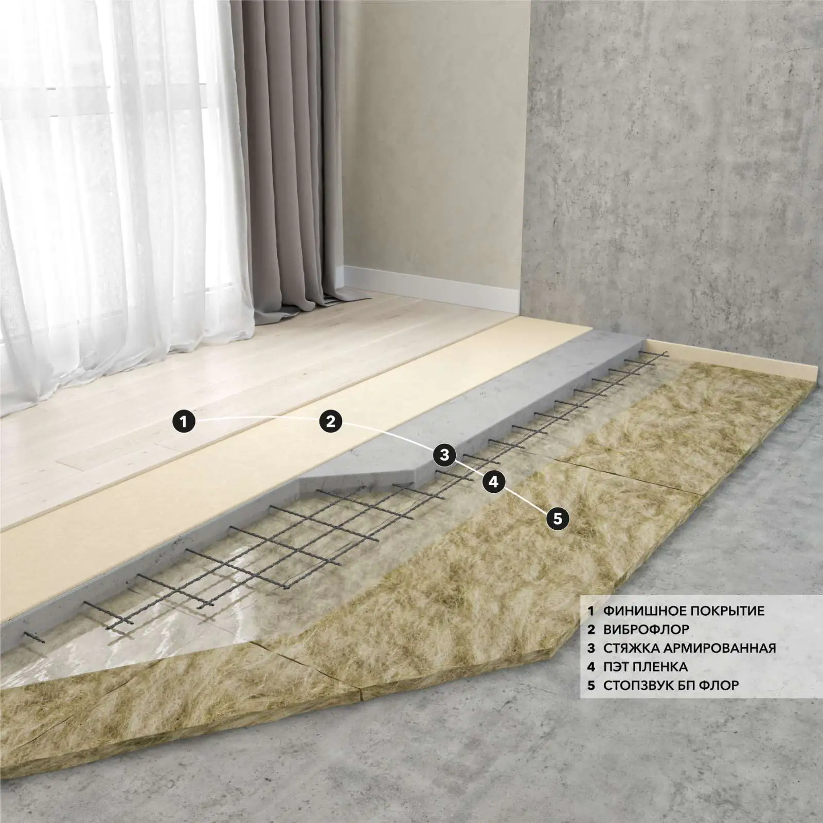 Материал применяется для звукоизоляции пола в конструкции "плавающих" стяжек в любых типах помещений, как в жилых квартирах, так и в производственных помещениях с особыми нормами по звукоизоляции. СтопЗвук БП Флор является полностью негорючим материалом, не подвергается гниению и воздействию насекомых/грызунов. Высочайшие показатели снижения шума и доступная цена делают этот материал одним из лидеров среди всех существующих материалов, предназначенных для звукоизоляции пола.