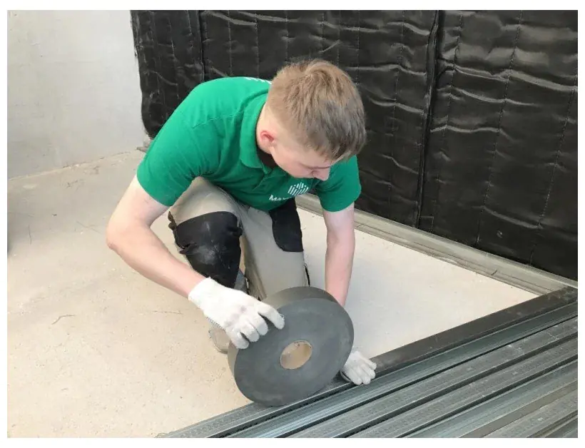 При монтаже каркасных перегородок и облицовок демпфирующая лента используется между профилями каркаса и несущими строительными конструкциями, а также в местах примыкания торцов обшивных листов перегородки (облицовки) к другим строительным конструкциям.