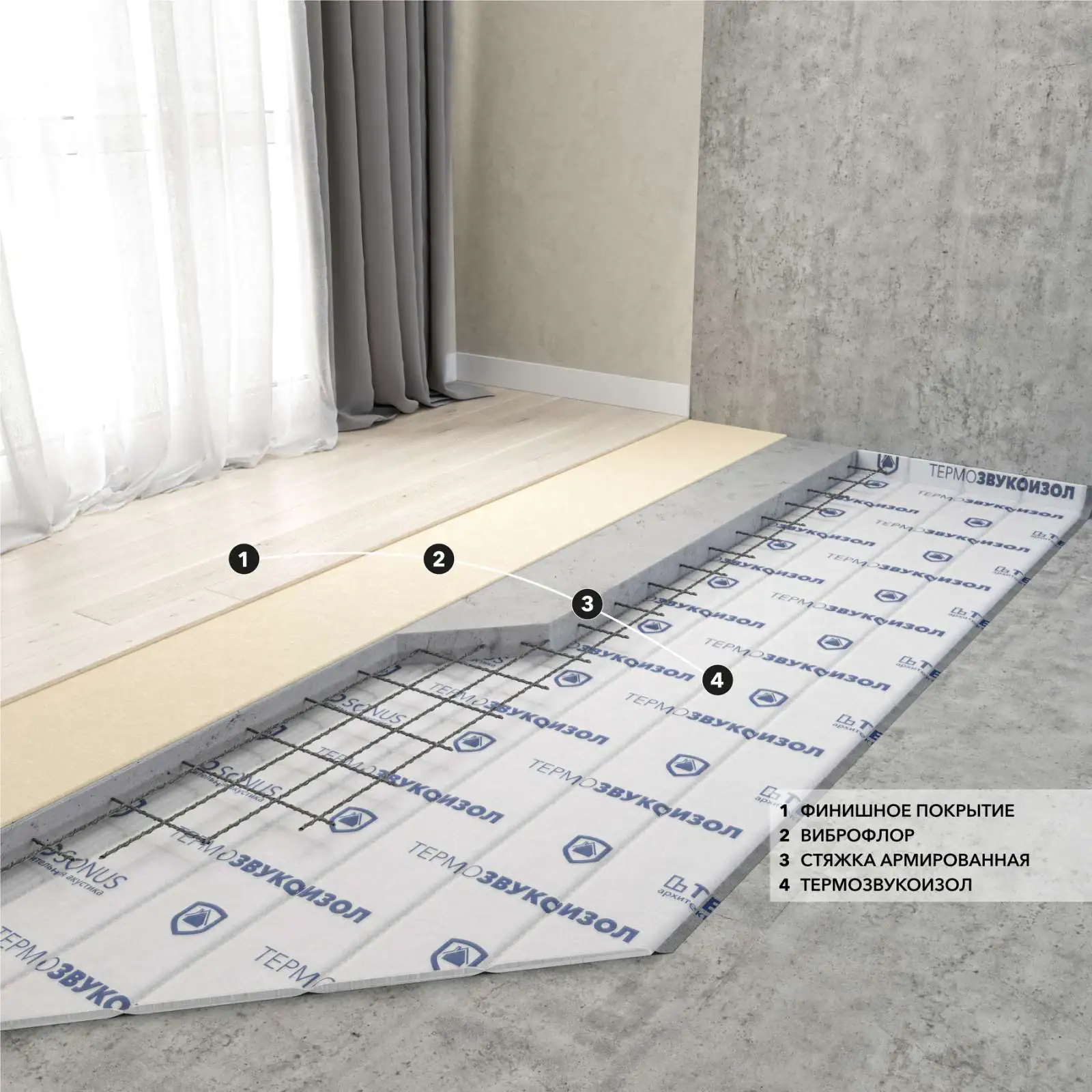 Снижение уровня ударного шума "плавающей" стяжкой, уложенной по слою материала ТермоЗвукоИзол толщиной 10 мм: ΔLnw = 28 дБ.