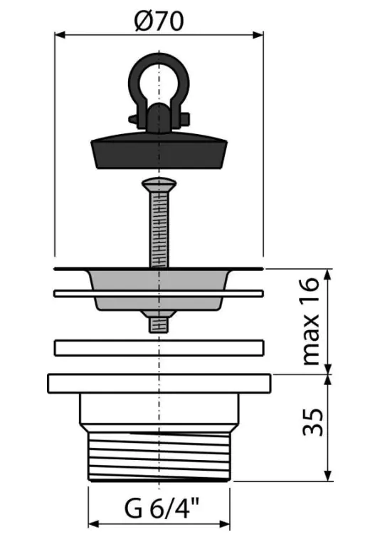 Донный клапан AlcaPlast A33 с резьбовым соединением для подключения сифона 6/4" с нержавеющей решеткой Ø70 мм и пробкой из ПВХ.