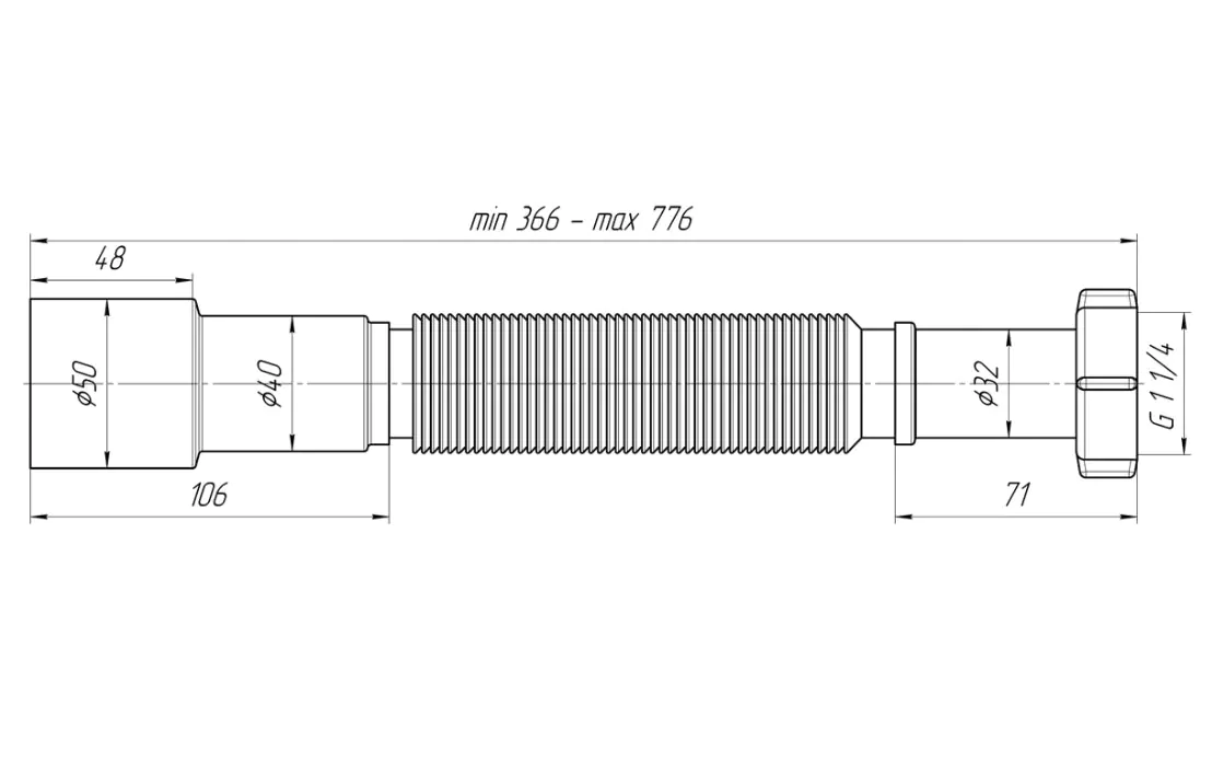 Гибкая гофрированная труба без выпуска для моек и умывальников АНИ Пласт K206 применяется для подключения умывальника к системе канализации. Труба 32 мм с помощью накидной гайки 1 1/4 крепится к выпуску умывальника, а гофрированная часть сифона легко сгибается для придания нужной формы и создания гидрозатвора. Гофротруба бесшовная, что исключает возможность протечки в местах спайки. Длина трубы 366-776мм. Выход в канализацию диаметром 40 или 50 мм. Материал сифона: полипропилен.
