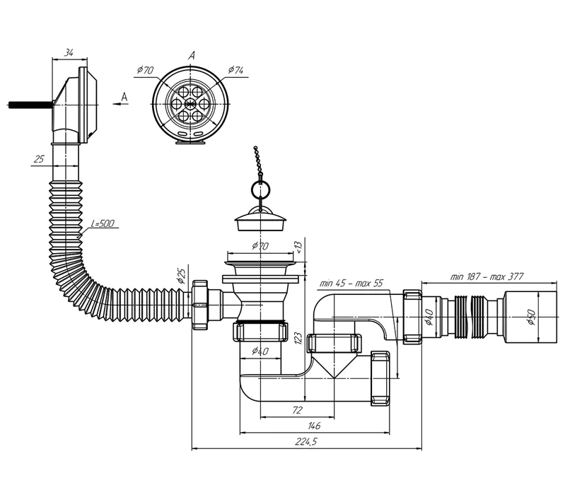 Сифон сливной АНИ Грот E255 предназначен для ванн с отверстием слива Ø50 мм и отверстием перелива от Ø36 до 63 мм (стандартное отверстие 50 мм). Тип сифона: регулируемый. Комплектуется гибкой трубой 40x50мм. Пропускная способность: 24 л/мин. Конструкция позволяет легко, без демонтажа, разобрать и почистить сифон в случае засорения, достать случайно упавшие в слив раковины мелкие ценные вещи.