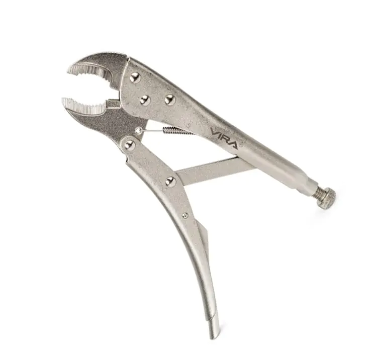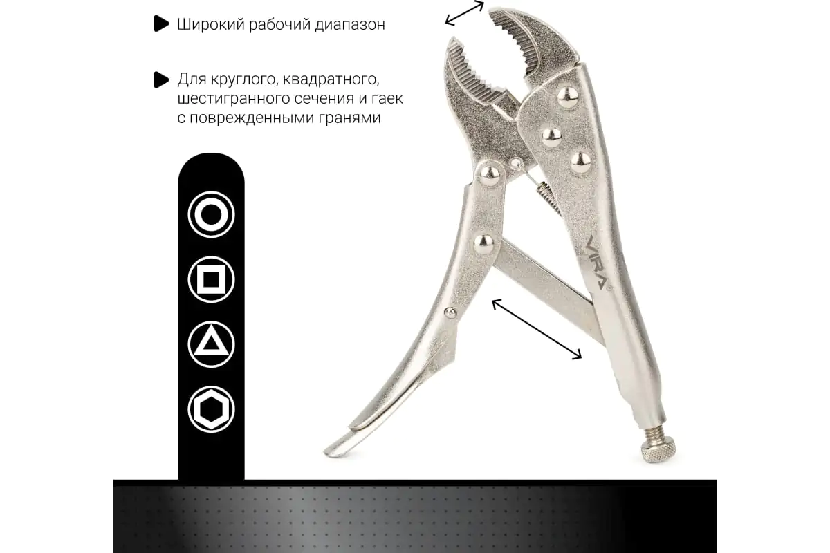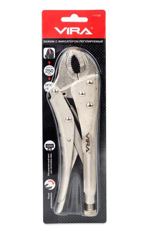 Зажим с фиксатором VIRA регулируемый, 250 мм 311133 – инструмент для захвата и фиксации плоских элементов и деталей неправильной формы. Используется при проведении слесарных, монтажных и сварочных работ. Изготовлены из углеродистой стали. Твердость по шкале Роквелла составляет 40 HRC. Приспособление имеет рукоятки с фиксирующим винтом.