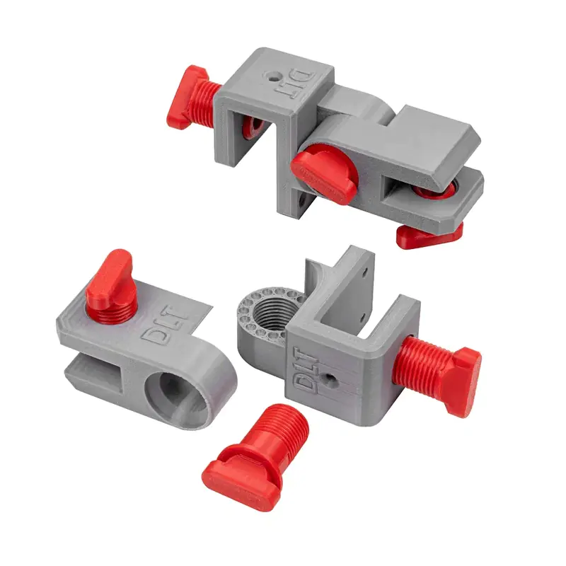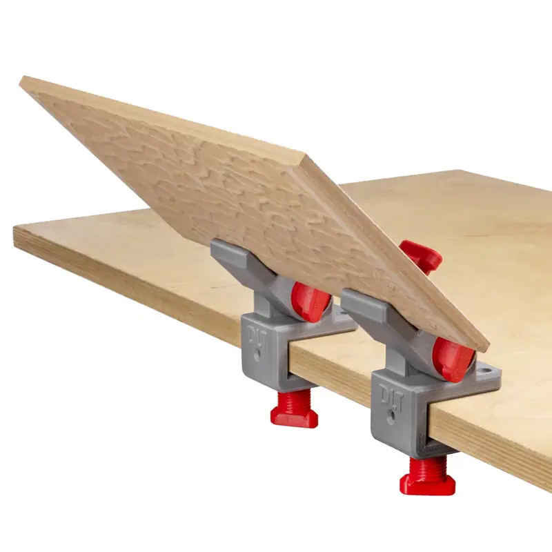 Изготовлен при помощи 3D-печати из износоустойчивого и безопасного пластика. Толщина зажима фиксации заготовки: до 12 мм. Толщина зажима фиксации к рабочей поверхности: до 20 мм.