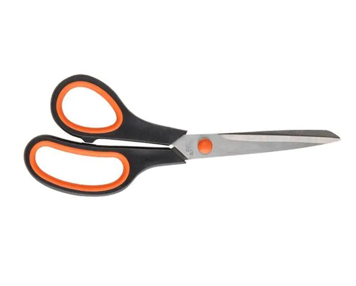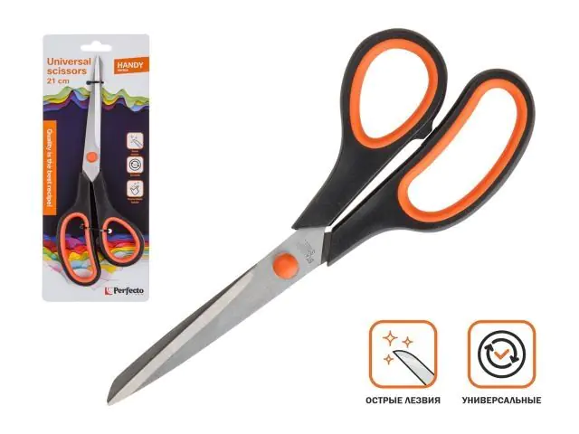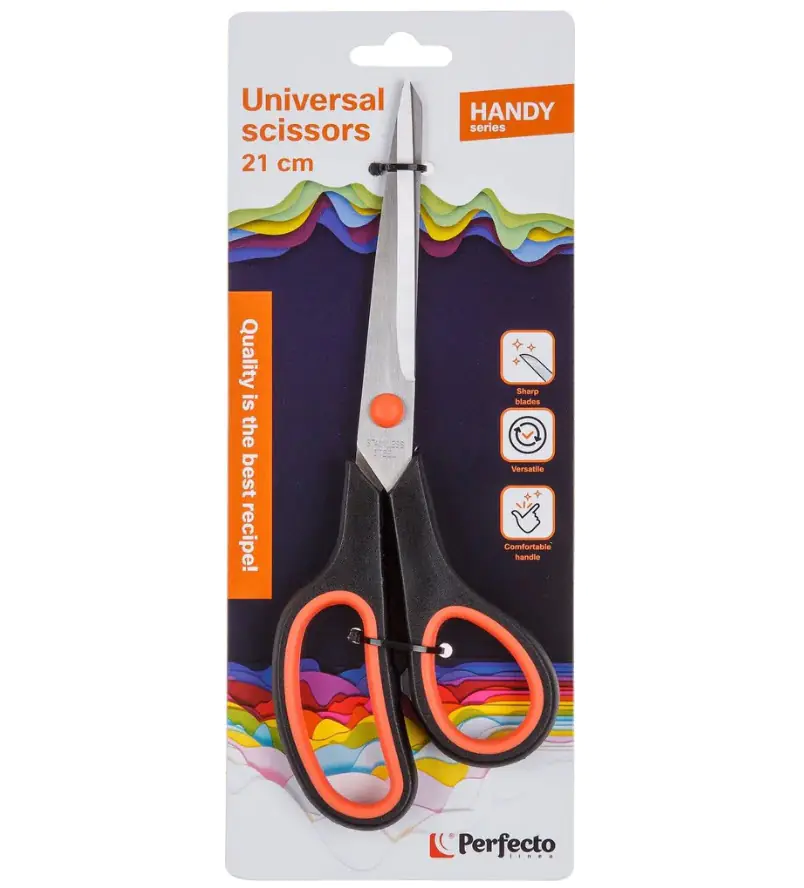 Универсальные ножницы подходят для резки бумаги, ткани, а также для разделки продуктов. Общая длина ножниц 21 см.