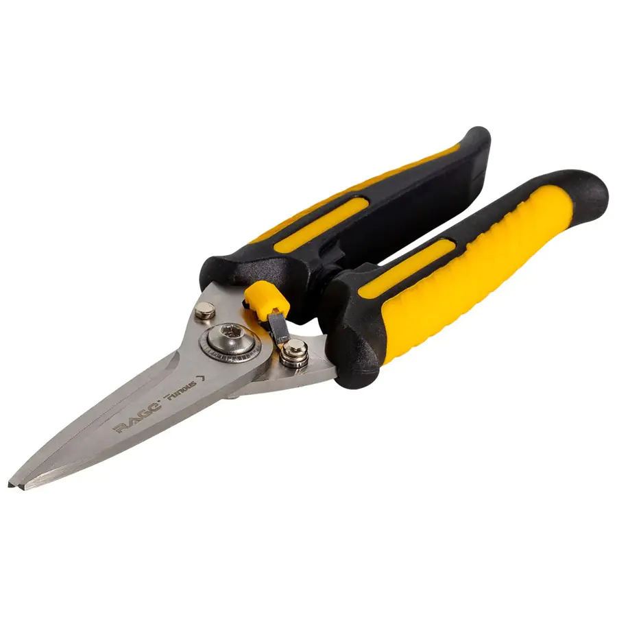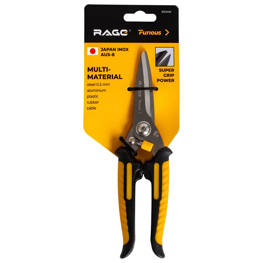 Ножницы многофункциональные по металлу и пластику прямого реза 200 мм RAGE Furious предназначены для разрезания различных материалов, таких как: листовая сталь до 0,5 мм, алюминий, медь, пластик, резина, кожа, проволока. Лезвия изготовлены из нержавеющей стали обладающей высокой прочностью и стойкостью к коррозии. Двухрычажный механизм и длинные ручки обеспечивают увеличенное усилие реза во время работы, которое позволяет осуществлять резку прочных материалов легко и эффективно.