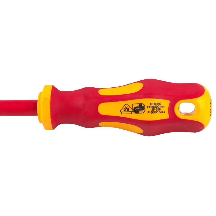 Диэлектрическая отвертка PH2x100 мм — профессиональный инструмент для безопасного электромонтажа. Изоляция стержня и рукоятки гарантирует защиту при работе под напряжением до 1000 В.