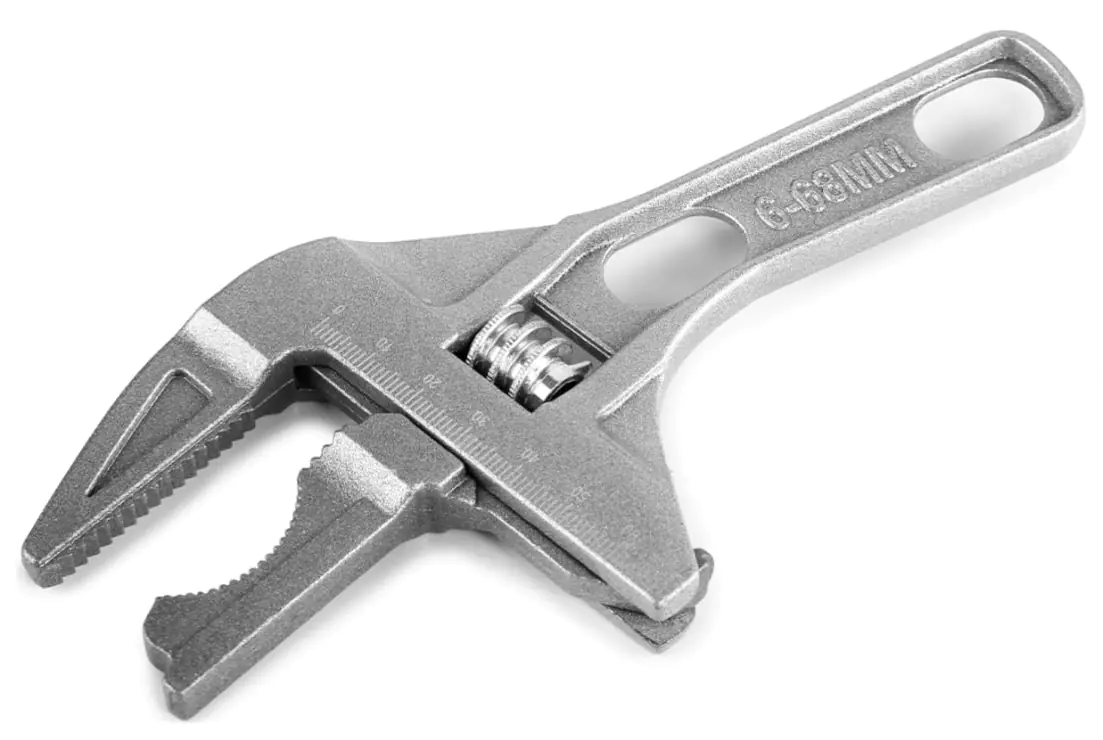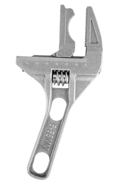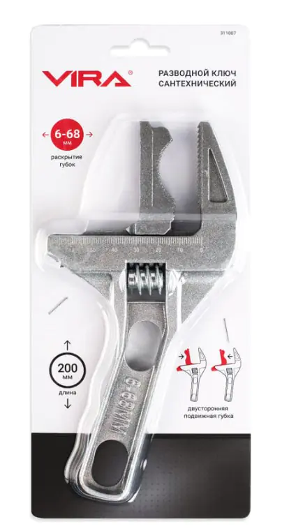 Разводной ключ для пластиковых коммуникаций, сантехнических сифонов. Широкий диапазон раскрытия губок 6-68 мм позволяет заменить собой несколько видов ключей. Двусторонняя подвижная губка с прямой и полукруглой сторонами подходит для работы с различными видами крепежных элементов. Инструмент изготовлен из алюминиевого сплава с дополнительным покрытием, защищающим от коррозии и окисления. Укороченная ручка позволяет работать в труднодоступных местах. Длина 200 мм.