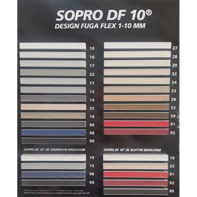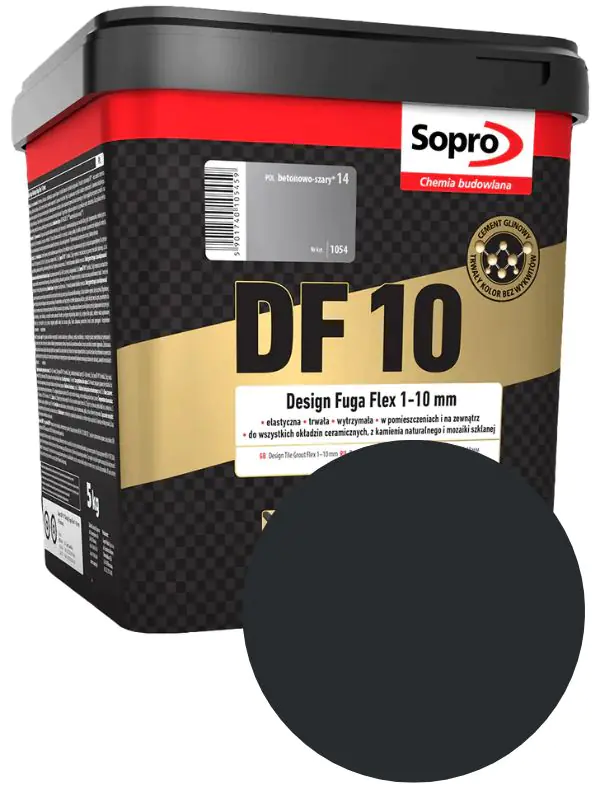 Фуга Sopro DF 10 (Сопро ДФ 10) – эластичная декоративная затирка, подходит для фугования всех керамических облицовок, бетонных плит и плит из натурального камня, стеклянной мозаики, конгломератов с шириной шва 1–10 мм. DF 10 подходит для применения в помещениях и снаружи, на стенах и полах. Пригодна для фугования тонких плиток и плит (толщиной менее 4 мм).