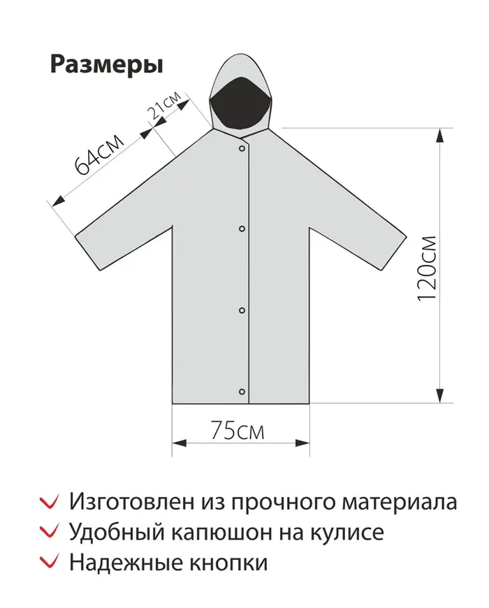 Дождевик изготовлен методом горячей пайки, что делает его полностью водонепроницаемым. Плотность материала позволяет использовать дождевик длительное время. Свободный фасон позволяет надевать дождевик поверх практически любой одежды. В сложенном виде плащ можно компактно разместить в рюкзаке или сумке.