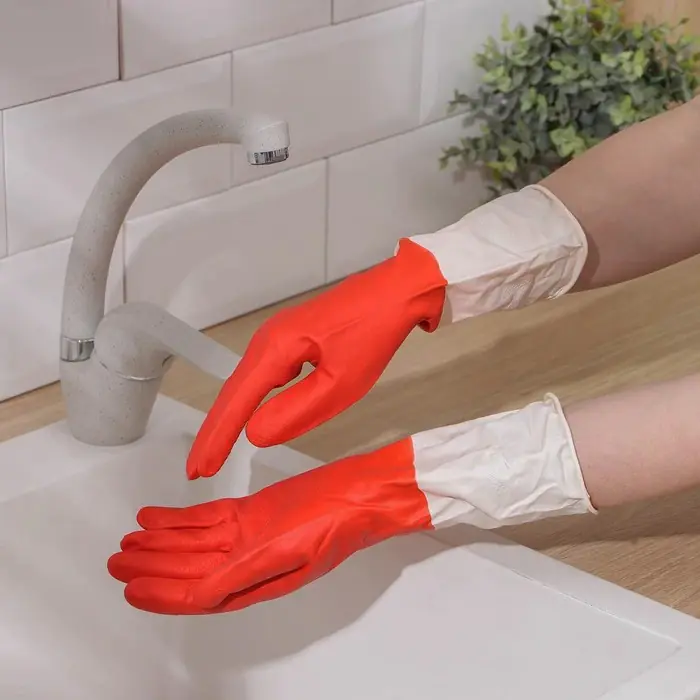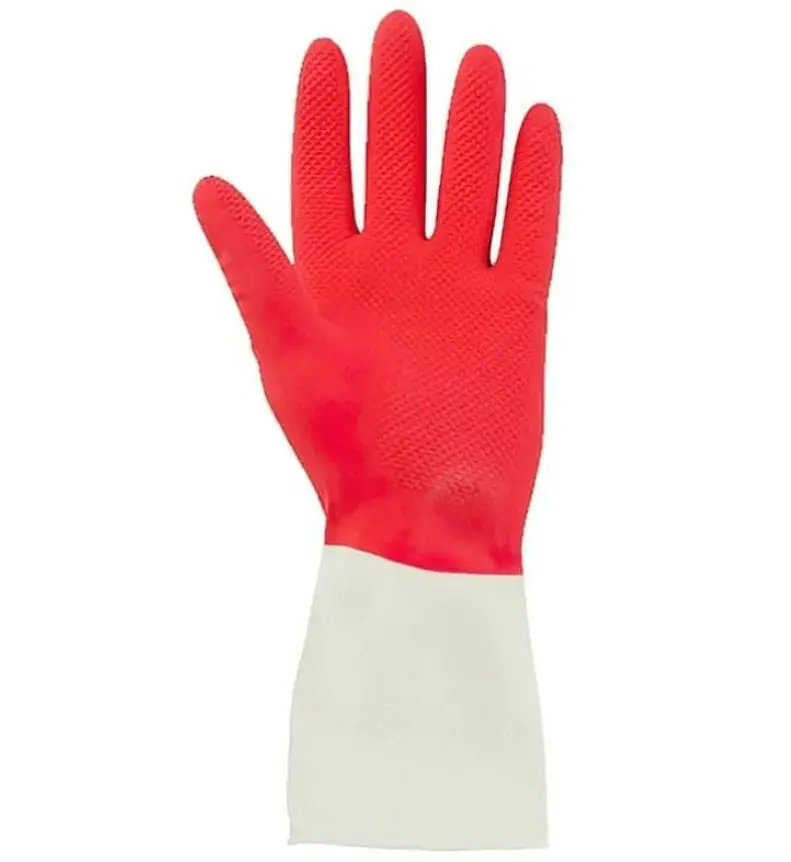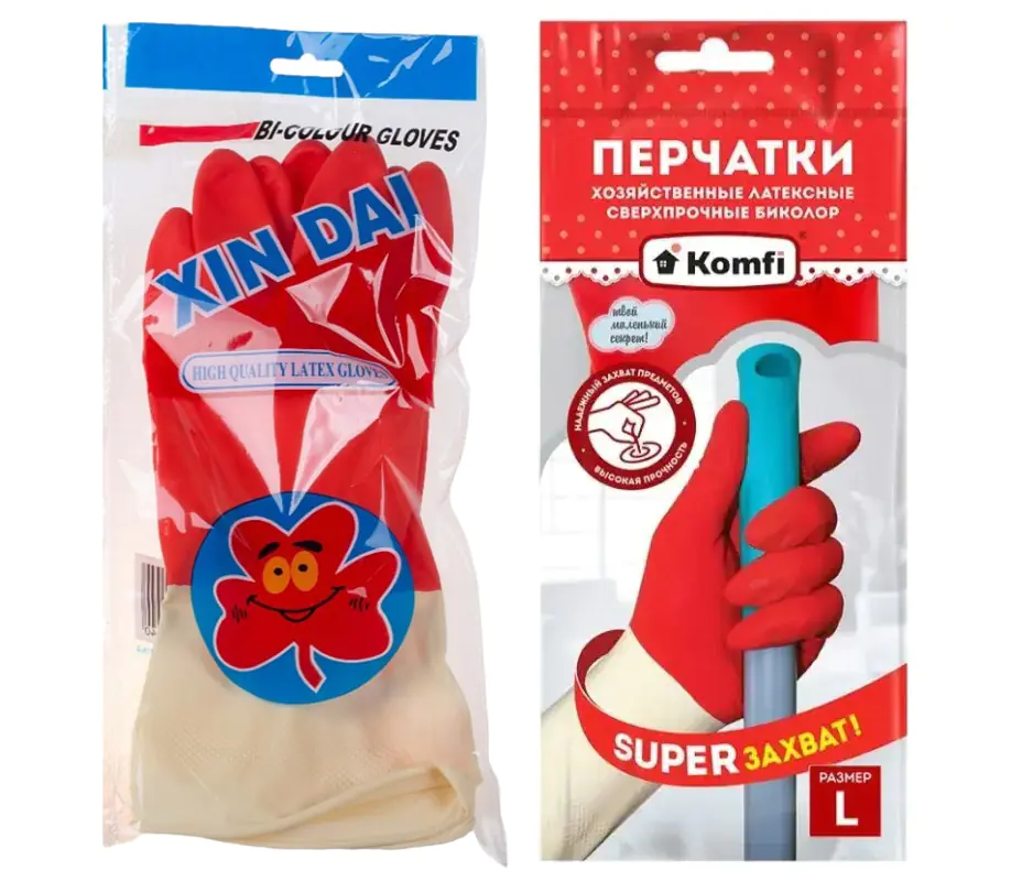 Высокопрочные перчатки без х\б напыления. Обеспечивают защиту рукам от мелких повреждений, грязи, красок и мыльных жидкостей. Перчатки обладают ярко выраженной текстурой на ладони, что позволяет прочно удерживать скользкие предметы в руке. Большим преимуществом перчатки является наличие двух зон: зона усиленного латекса (кисть красного цвета) и зона без усиления (манжета белого/желтого цвета). Размер L.
