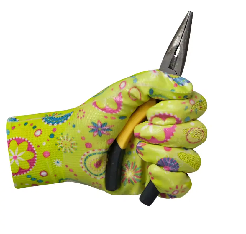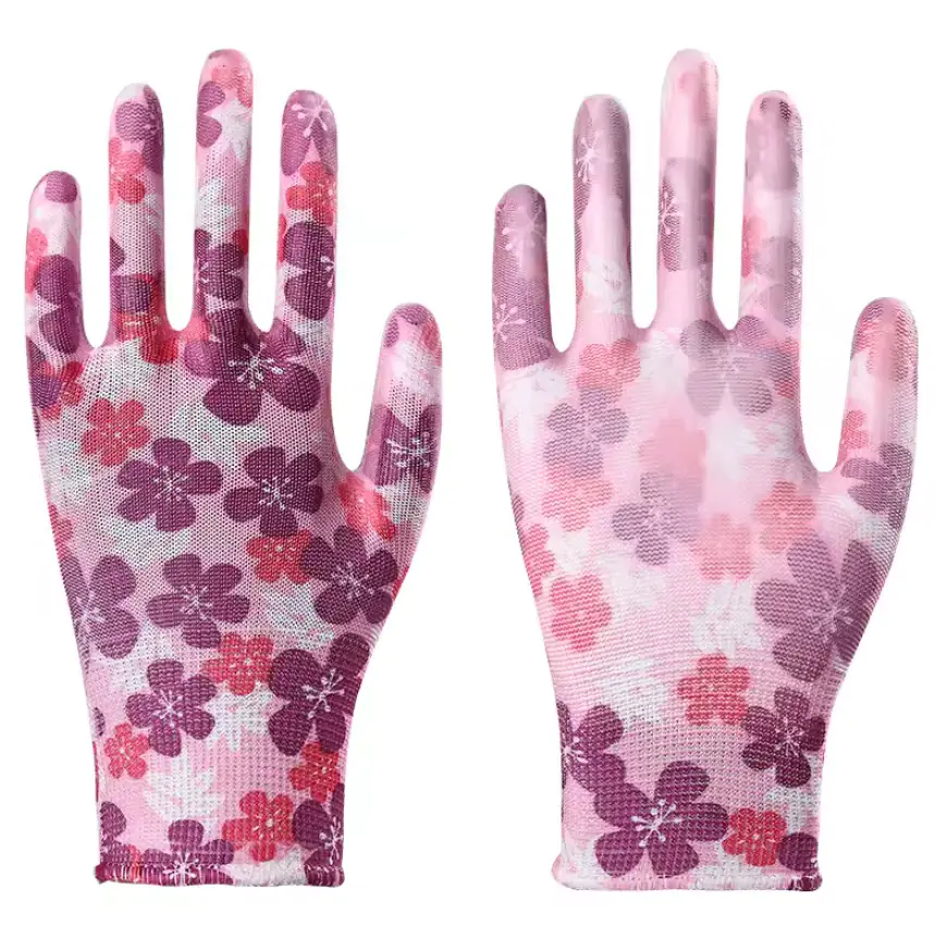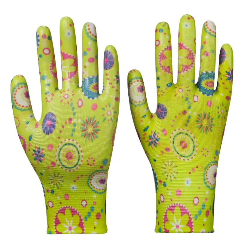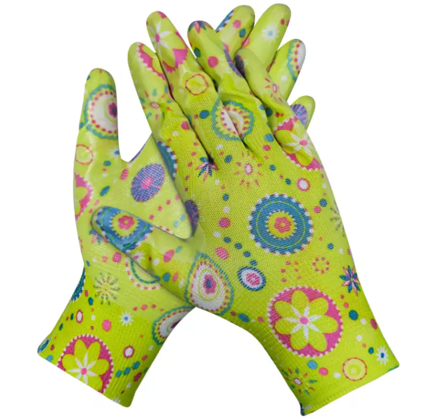 Перчатки садовые нейлоновые с нитриловым покрытием подходят для домашних и садовых работ. Превосходная эластичность и устойчивость к истиранию, сопротивление разрыву. Стойкость покрытия к слабым растворам кислот, щелочей, нефтепродуктов. Материал нейлон с нанесенным принтом покрытый прозрачным нитрилом. 13-й класс вязки. Манжеты выполнены из эластичной резинки. Размер М (8). Цвет розовый/зеленый.