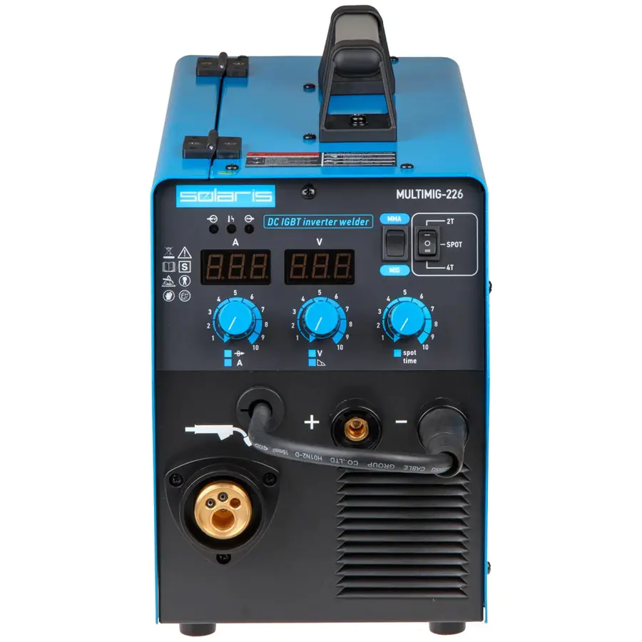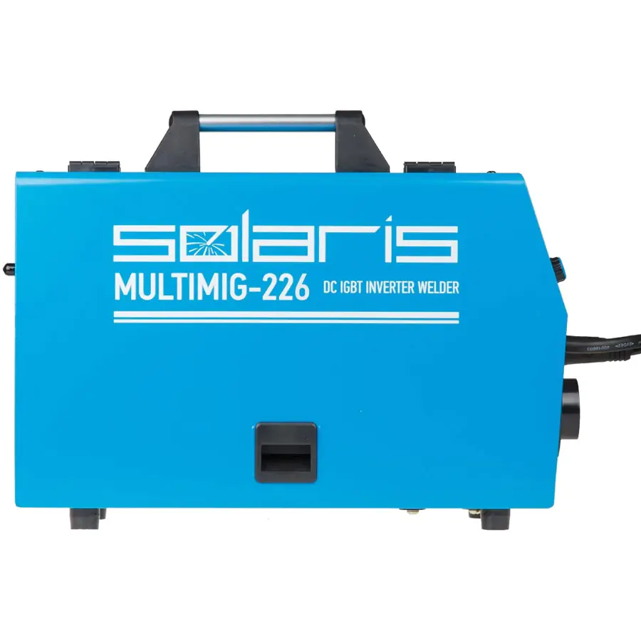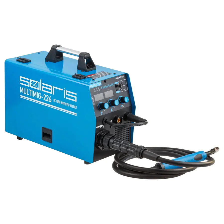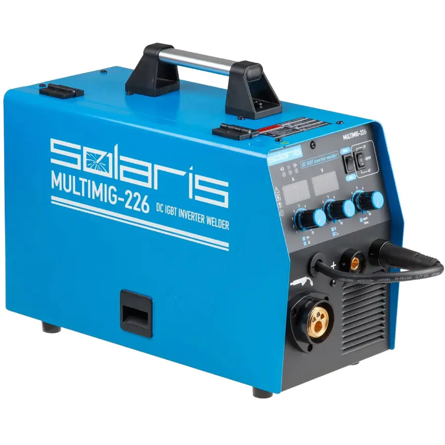 Полуавтомат сварочный Solaris MULTIMIG-226, позволяющий варить в режиме полуавтоматической MIG/MAG/FLUX и в режиме ручной дуговой (ММА) сварки. Аппарат оснащен евроразъемом для горелки, возможностью смены полярности для сварки проволокой без газа (FLUX). Аппарат построен с использованием IGBT-транзисторов, обладает набором функций HOT START, ANTISTICK; имеет защиту от перегрева, перегрузки.
