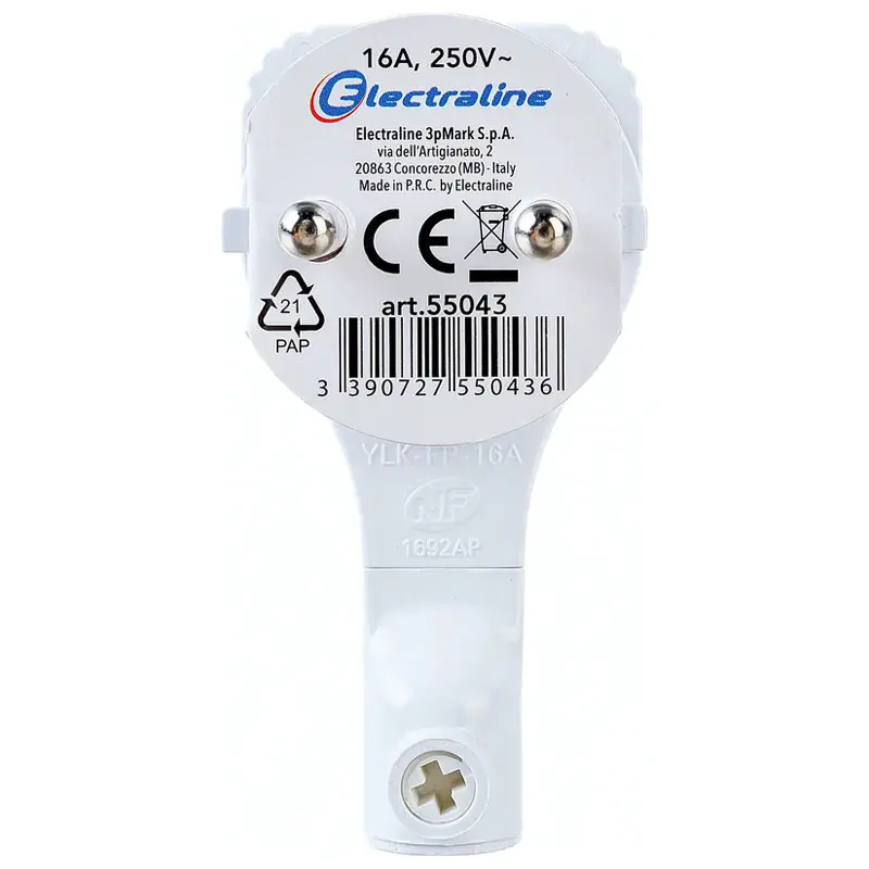 Угловая плоская вилка с заземлением 16А белая Electraline 55043 служит для присоединения электрических приборов к сети. Разборная конструкция плоской формы удобна для использования с розетками, которые расположены за шкафом. Цвет - белый.