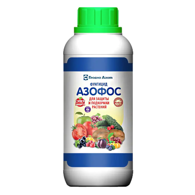 Фунгицид "Азофос" предназначен для защиты растений (картофеля, томатов в защитном грунте, огурцов в защитном грунте, вишни, сливы, алычи, черной смородины, клюквы крупноплодной, брусники обыкновенной, яблони) от грибковых заболеваний. Действующим веществом фунгицида являются медьсодержащие фосфаты аммония сложного состава.