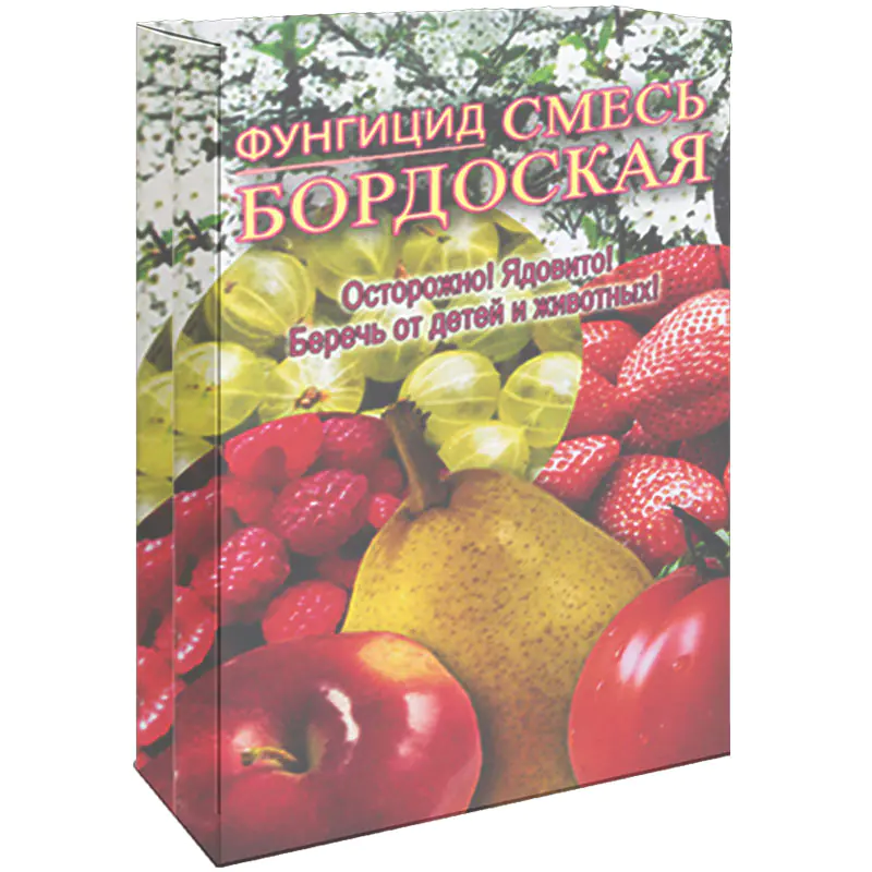 Фунгицид для приготовления бордоской жидкости для опрыскивания плодовых, овощных, ягодных культур против комплекса болезней (на яблоне, груше, картофеле и огурце открытого и защищенного грунта, луке (кроме лука на перо), сливе, черешне, смородине, крыжовнике, землянике, малине). Соотношение медного купороса и извести - 50/50.