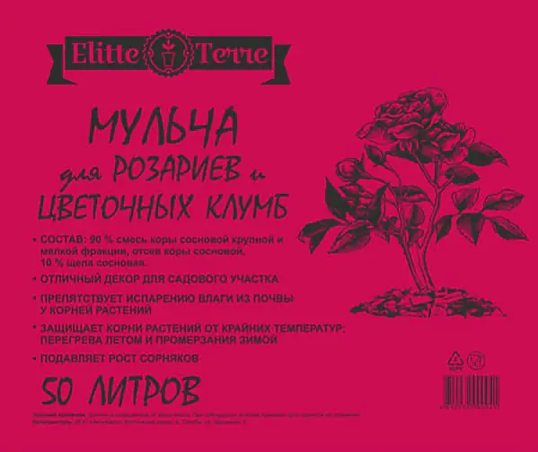 Мульча для розариев и цветочных клумб Elitte Terre – это подсыпка, в состав которой входят: смесь коры сосновой крупной и мелкой фракции, отсев коры сосновой, щепа сосновая. Мульча защищает корни растений от крайних температур: от перегрева летом и промерзания зимой. Подавляет рост сорняков. Препятствует испарению влаги из почвы у корней растений.
