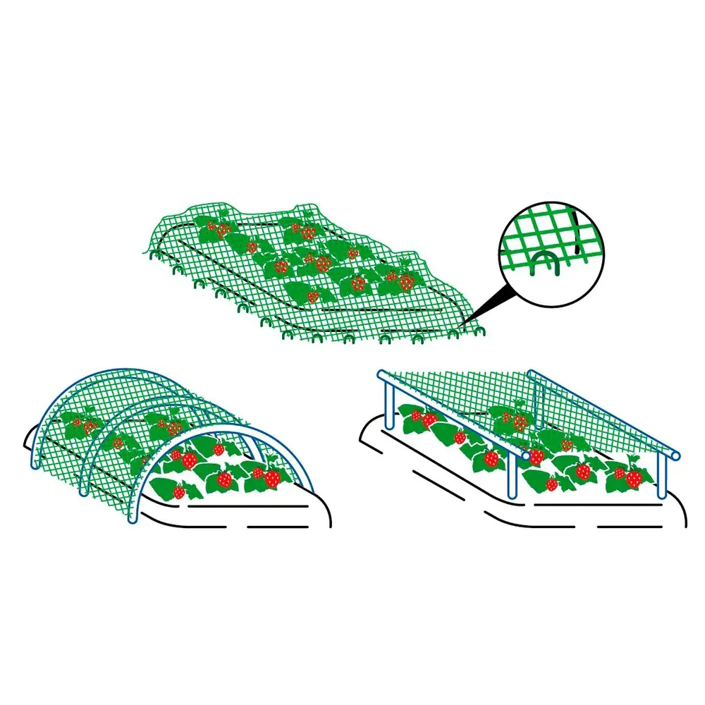 Растянуть над грядкой/кустом/деревом, закрепив края сетки. На деревья разместить сетку при помощи шестов (в комплект не входят).