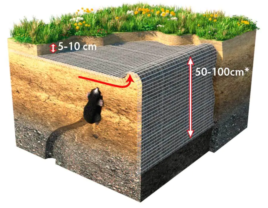 Мелкоячеистая пластиковая сетка применяется для защиты газона от кротов. Материал укладывается в основание газона и становится механическим барьером, мешающим зверькам перемещаться по участку и не позволяющий им выбираться на поверхность. При невозможности разрывать норы до самой поверхности грунта кроты покидают данную территорию.