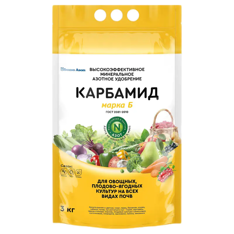 Карбамид или иначе, мочевина – это азотное удобрение, которое содержит не менее 46% азота. Карбамид обладает отличными физико-химическими свойствами (повышенная прочность гранул, пониженная слеживаемость и влагопоглощение).