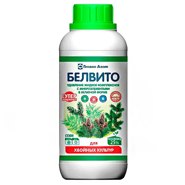 Высококачественное жидкое удобрение с микроэлементами БЕЛВИТО для подкормки хвойных культур. Способствует увеличению роста на 25 % и развитию хвойных культур, повышению их декоративности (более повышенный окрас хвои).