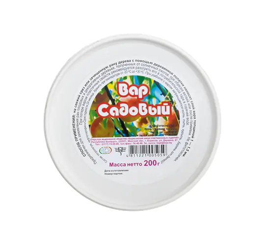 Биотехническое средство для защиты ран плодовых и декоративных деревьев, полученных от солнечных ожогов, при обрезке ветвей или после прививки. Способ применения: на свежий срез или зачищенную рану дерева с помощью деревянной лопатки наносят слой вара толщиной 1 - 1,5 мм. Состав: петролатум, нефтепарафины.
