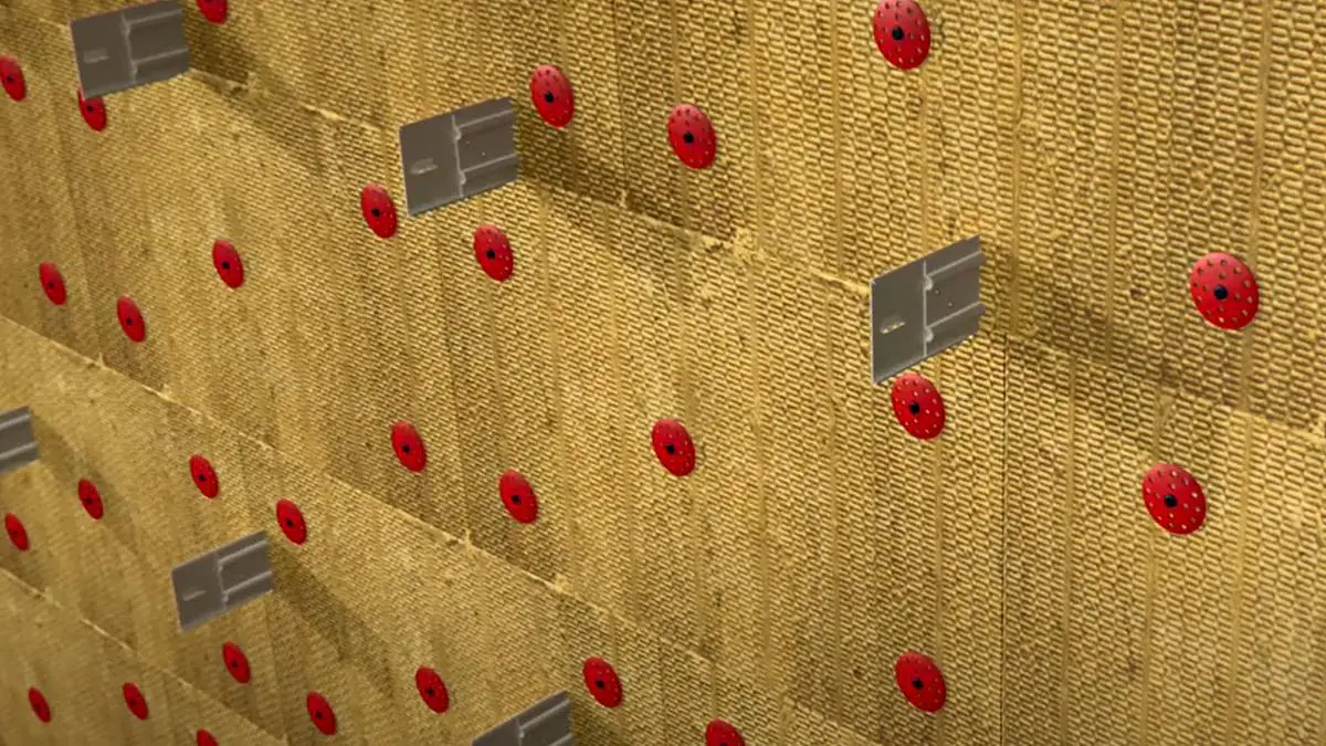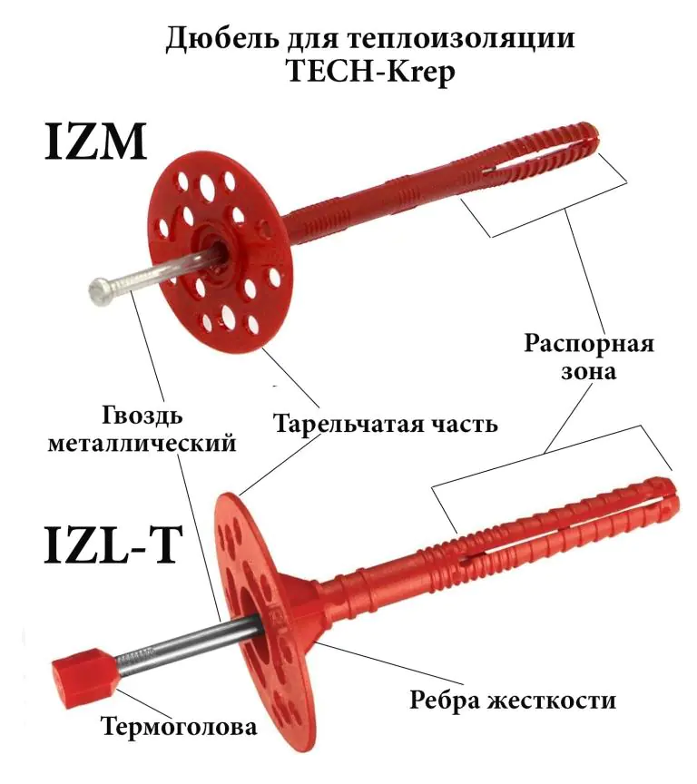 Фасадный утеплитель сначала приклеивается к поверхности клеем, затем крепится зонтами (они же - фасадные дюбель-гвозди). Длина зонта должна превышать толщину утеплителя на 70 мм. Т.е. если утеплитель толщиной 50 мм, то зонт нужно применять длиной 120 мм.
