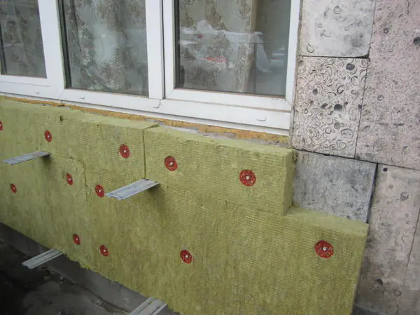 Фасадный утеплитель сначала приклеивается к поверхности клеем, затем крепится зонтами (они же - фасадные дюбель-гвозди). Длина зонта должна превышать толщину утеплителя на 70 мм. Т.е. если утеплитель толщиной 50 мм, то зонт нужно применять длиной 120 мм.